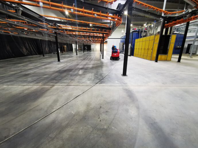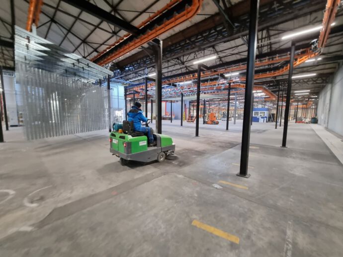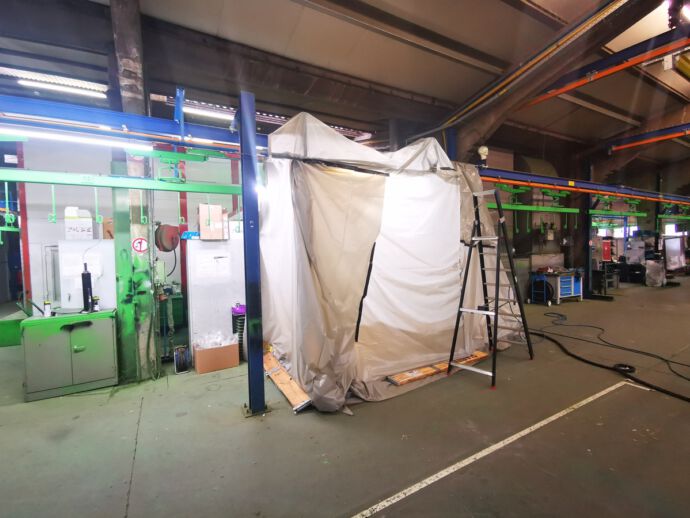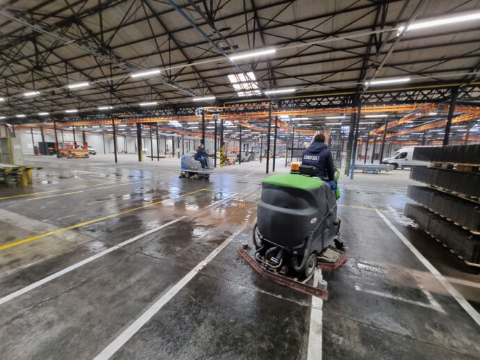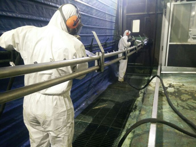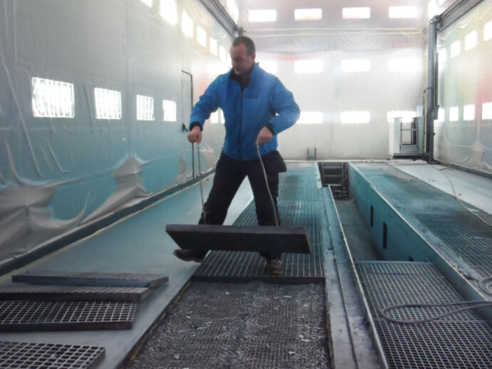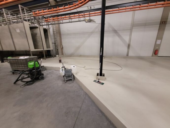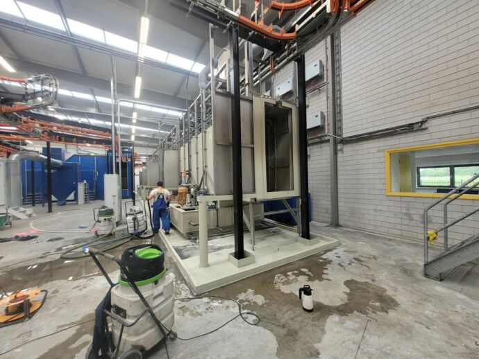 - Machinale reiniging plafond-, muur- en vloerdelen met inbegrip van het exterieur van de installatie na uitstoot poederlak.