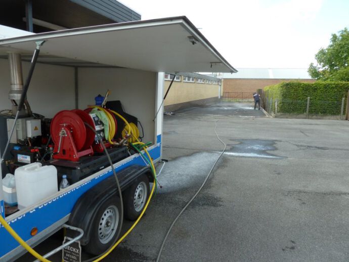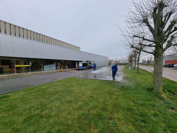 - Daarna reinigen we je oprit met een veegmachine, hogedrukreiniger en/of stoomreiniger, … in combinatie met milieuvriendelijke schoonmaakmiddelen.