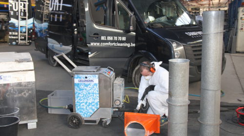 - Droogijsstralen van de verontreinigde in- en uitgang van de bak/moffeloven + kettingbaan + sas tot in de oven + detail op aanzuigventilator kanalen + rookgasafvoer