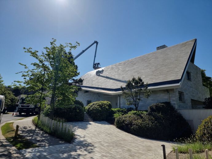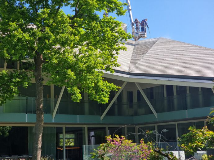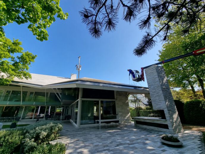 Comfort Cleaning slaagde er dus in het volledige dak te bereiken met behulp van een hijskraan en spinhoogwerker.