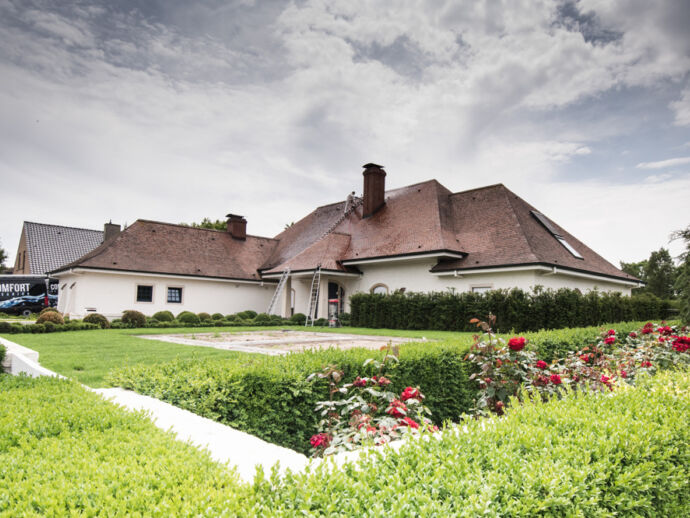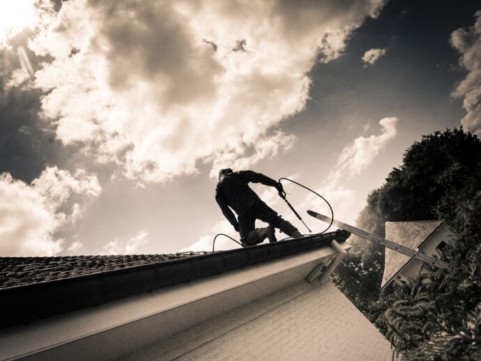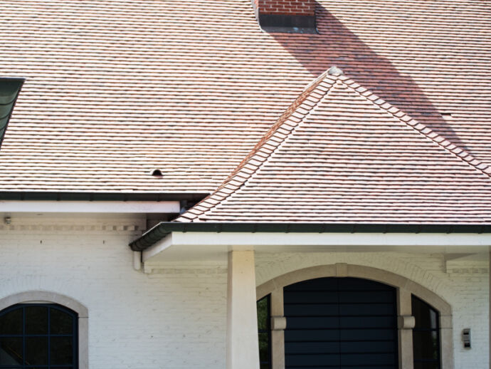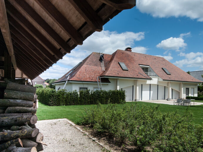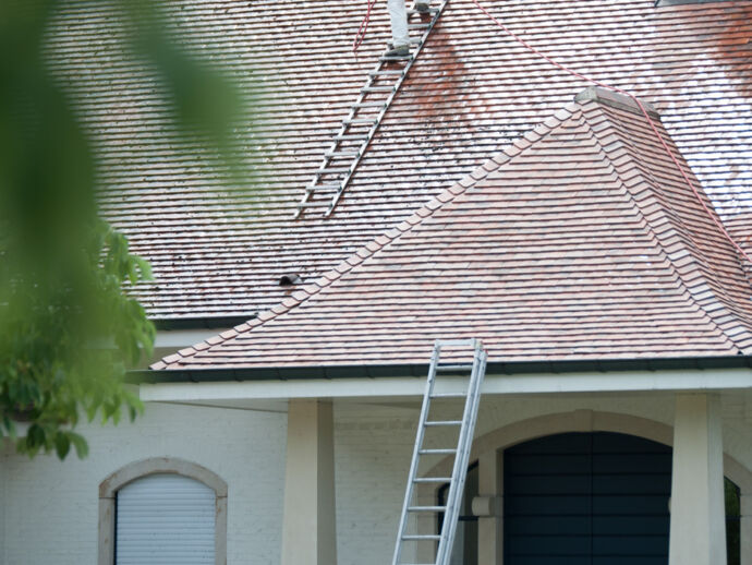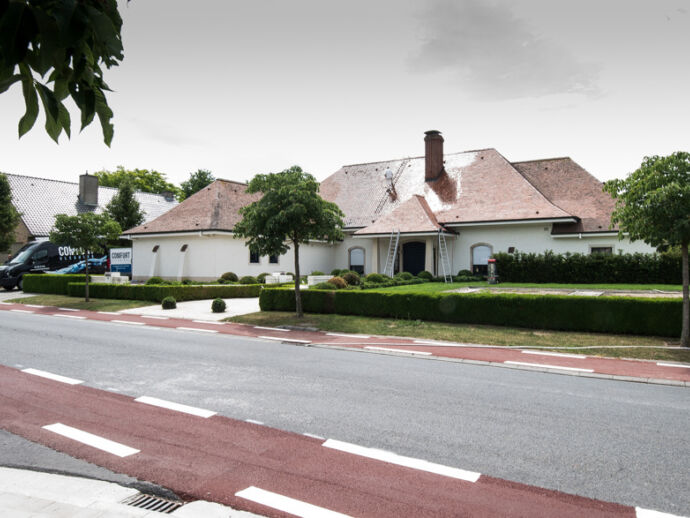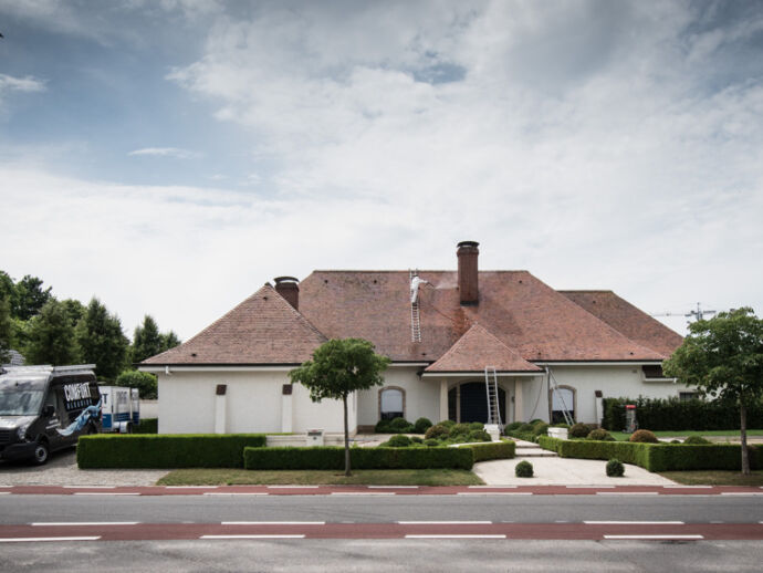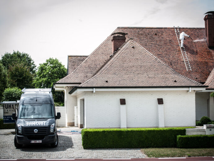 De Franse tegelpan, een pansoort die met de uiterste voorzichtigheid dient gereinigd te worden. Enkel met onze speciale dakladders, kunnen we het dak op een veilige manier betreden. Een dakreiniging uitgevoerd op een geheel biologische manier. Deze woning straalt terug zoals voorheen.