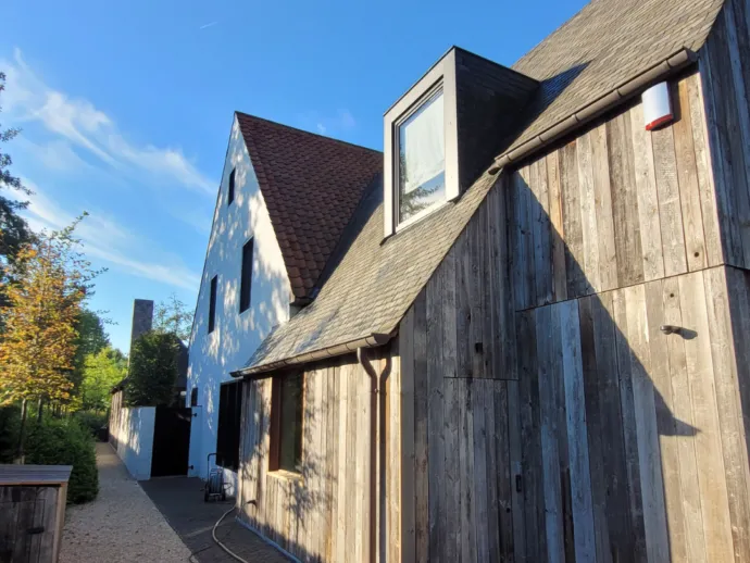 Comfort Cleaning volbracht deze dakreiniging van een oude Boomse pan en natuursteenlei door een stoomreiniging onder heet water en lage druk, met een algvertragende nabehandeling.