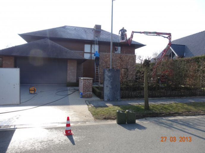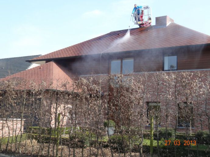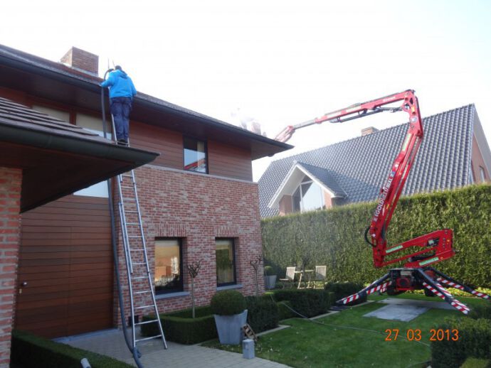 Dakreiniging van een woning, met de hulp van een spinhoogtewerker.
