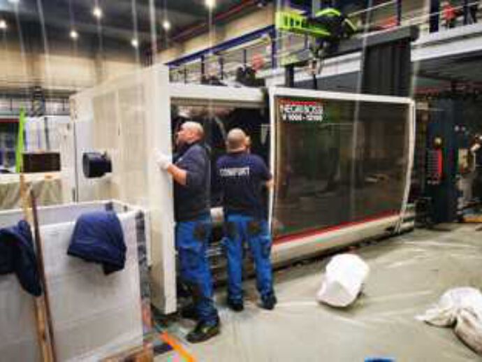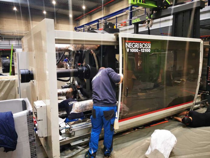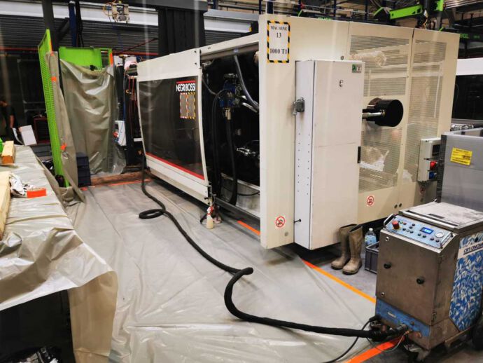 Deze spuitgietmachine werd na verhuis volledig gereinigd onder de techniek van droogijsstralen en degreasing.