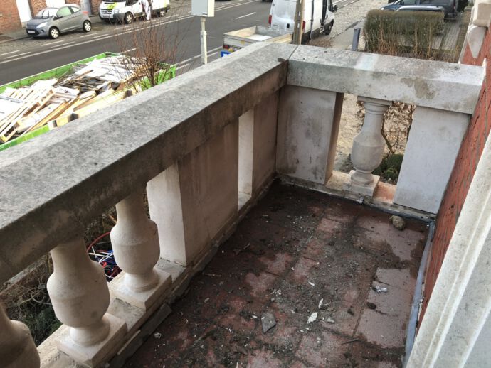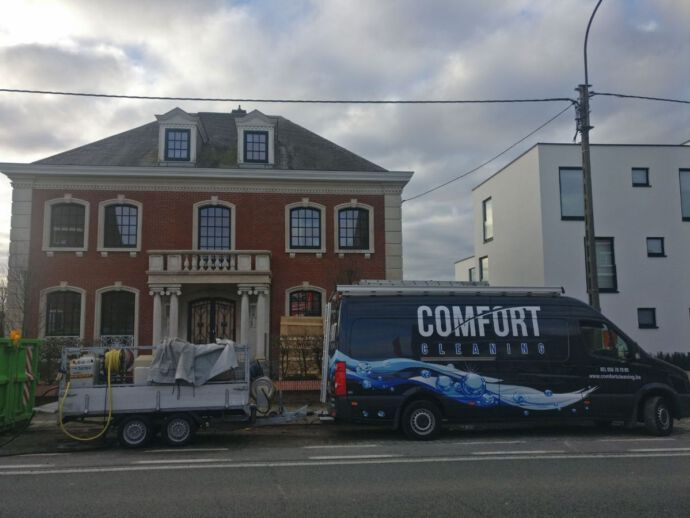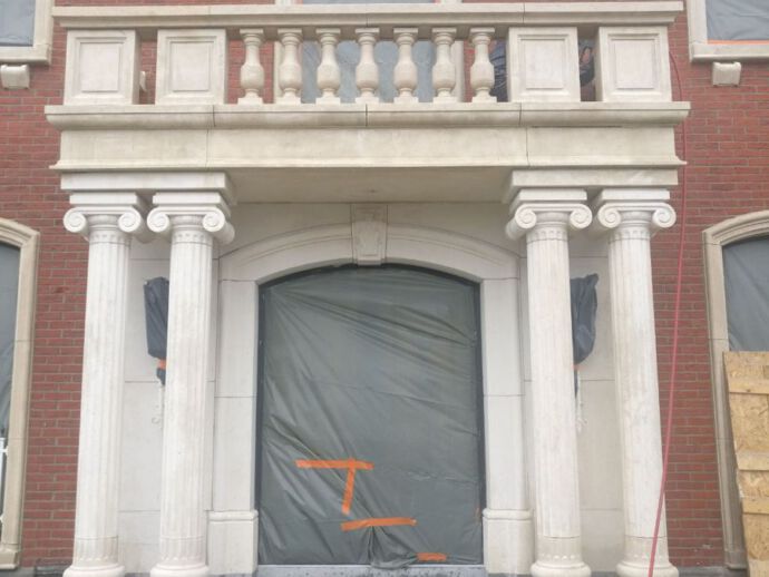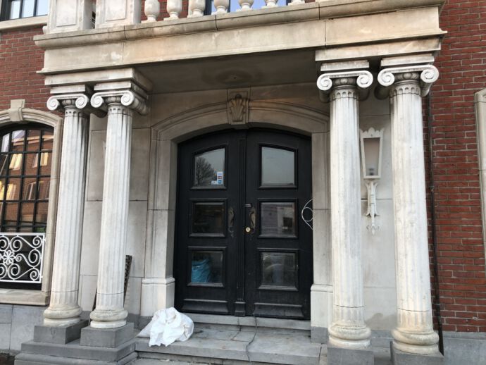 Ter voorbereiding van de opening van de bruidsboetiek Dianna David te Bissegem, werd het inkomportaal in Franse witsteen minutieus onder handen genomen. Werken met een puur product als Franse witsteen is droom voor iedere uitvoerder. Deze kalkhoudende natuursteen werd productloos gereinigd d.m.v. torbo stralen onder een werkdruk van 3 bar met een toevoeging van mineralen. Door het soft nevel stralen zijn we erin geslaagd de Franse witsteen tot in de diepte te reinigen, zonder schade te berokkenen aan deze toch zeer poreuze kalksteen. Weldra wordt de Franse witsteen nog voorzien van een hydrofuge of silicone genaamd om zijn weerbaarheid tegen de weersinvloeden en atmosferische vervuiling te verbeteren. Later op het jaar worden de raamomlijstingen en hoekstenen van de gevel in Franse witsteen onder handen genomen.