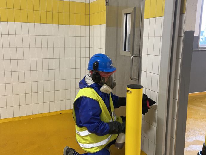 Rekening houdend met de geschikte persoonlijke beschermingsmiddelen in functie van het gebruik van dit sterk alkalische reinigingsproduct, kunnen onze medewerkers in veiligheid deze gedetailleerde opdracht uitvoeren.