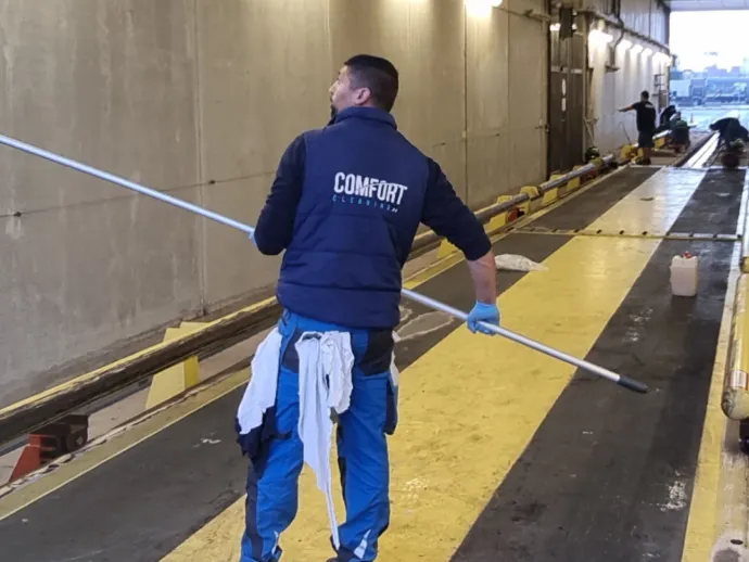 Betonnen muren en technische installaties werden zorgvuldig gereinigd, evenals de röntgeninstallatie en steeldeck panelen. De machinekamers kregen een zorgvuldige droogzuiging van de vloeren.