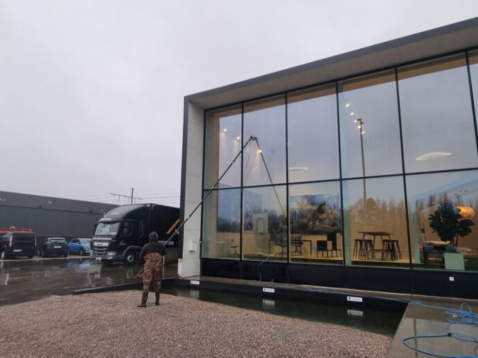 Bij grote glaspartijen, zoals bij Buro Modern, kiezen we meestal voor osmose reiniging. Dankzij osmose reiniging kunnen we grote oppervlakken op snelle tijd afwerken en is geen dure stelling of hoogtewerker nodig. Osmosewater wordt tot 99% gezuiverd of gedemineraliseerd en ontdaan van chloor en bacteriën. Hierdoor hebben we geen zeep of andere reinigingsmiddelen nodig, maar krijg je toch een perfect, streeploos resultaat.