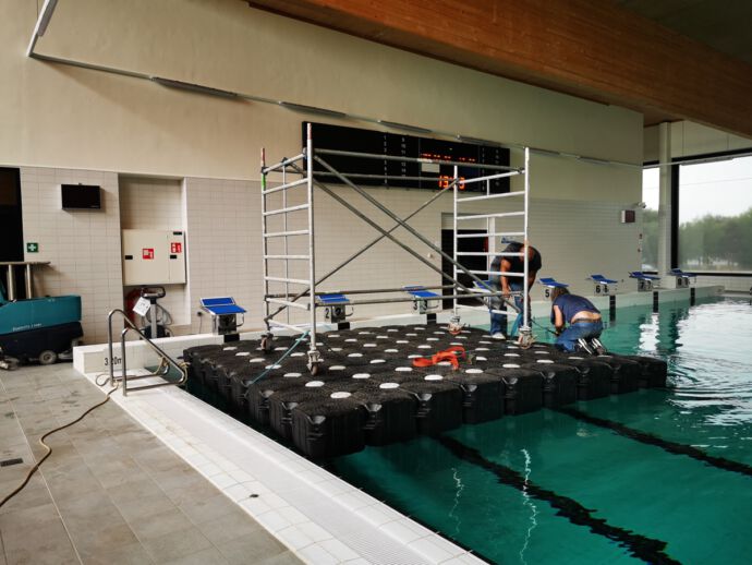 Daar het plaatsen van een lift niet haalbaar bleek, stelden we onze werkplaats van op een hiervoor speciaal samengesteld werkponton.